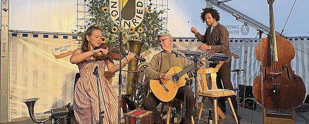Neben den grandiosen Texten und der geerdeten Art, mit den Gästen zu kommunizieren, zeichnet das Trio noch eine wichtige Sache aus: Sie sind hervorragende Multi-Instrumentalisten. Knapp 20 Musikgeräte waren auf der kleinen Bühne vorbereitet. Darunter ein Kontrabass, ein Hackbrett, eine Strohgeige, eine Ziach plus Akkordeon, eine Gitarre, Blockflöten, eine Tuba und noch vieles mehr. Alles nötig, wenn man ganz verschiedene musikalische Genres bedienen will. So hörten die Gäste beispielsweise den wohl ersten Reggae-Song, der auf einem Hackbrett gespielt wurde. Oder einen sauberen Hiphop-Song, bei dem die Tuba den Bass vorgibt.